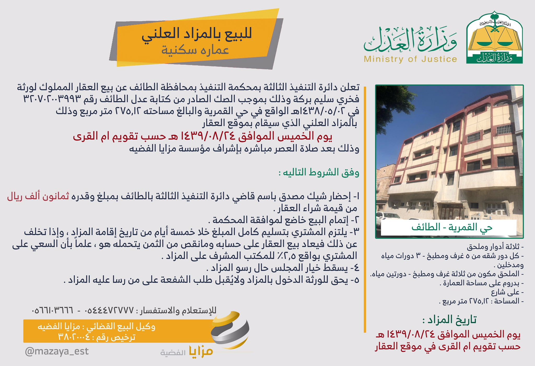 مزايا الفضيه V Twitter للبيع بالمزاد العلني بـ الطايف يوم الخميس 1439 08 24 هـ نوع العقار عماره سكنيه 3 ادوار وملحق المساحه 275 12 متر مربع الموقع حي القمريه
