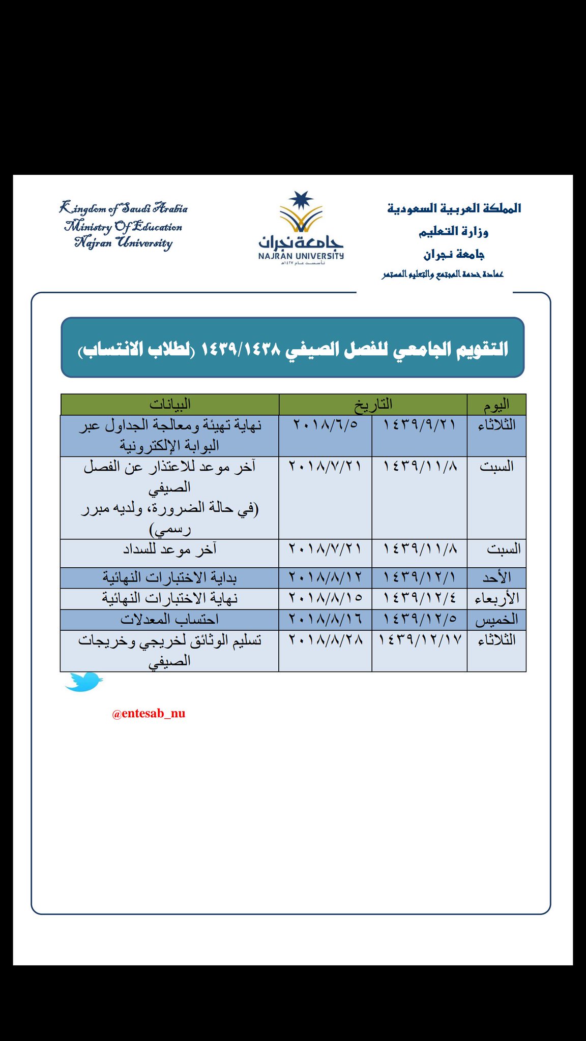 الانتساب جامعة نجران على تويتر التقويم الصيفي لطلاب الانتساب للعام الجامعي 1438 1439