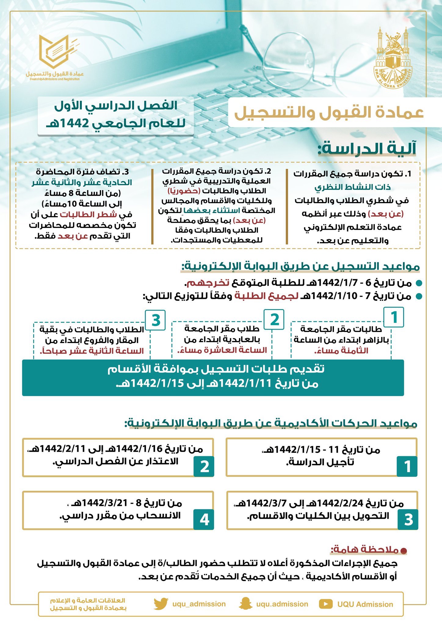 عمادة القبول و التسجيل On Twitter إعلان هام آلية الدراسة بالفصل الدراسي الأول للعام الجامعي 1442هـ و مواعيد التسجيل و الحركات الأكاديمية عن طريق البوابة الإلكترونية Https T Co Z1zfoosyhu