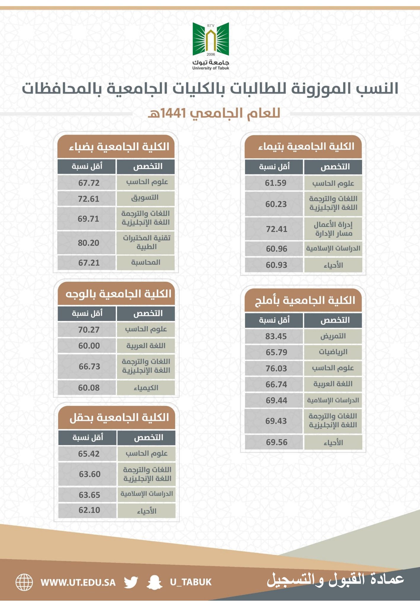 عمادة القبول والتسجيل En Twitter تعلن عمادة القبول والتسجيل جامعة تبوك عن أقل نسبة موزونة أو مكافئة تم قبولها في جميع التخصصات للطلاب والطالبات في مقر الجامعة الرئيسي والكليات الجامعية بالمحافظات للعام الجامعي