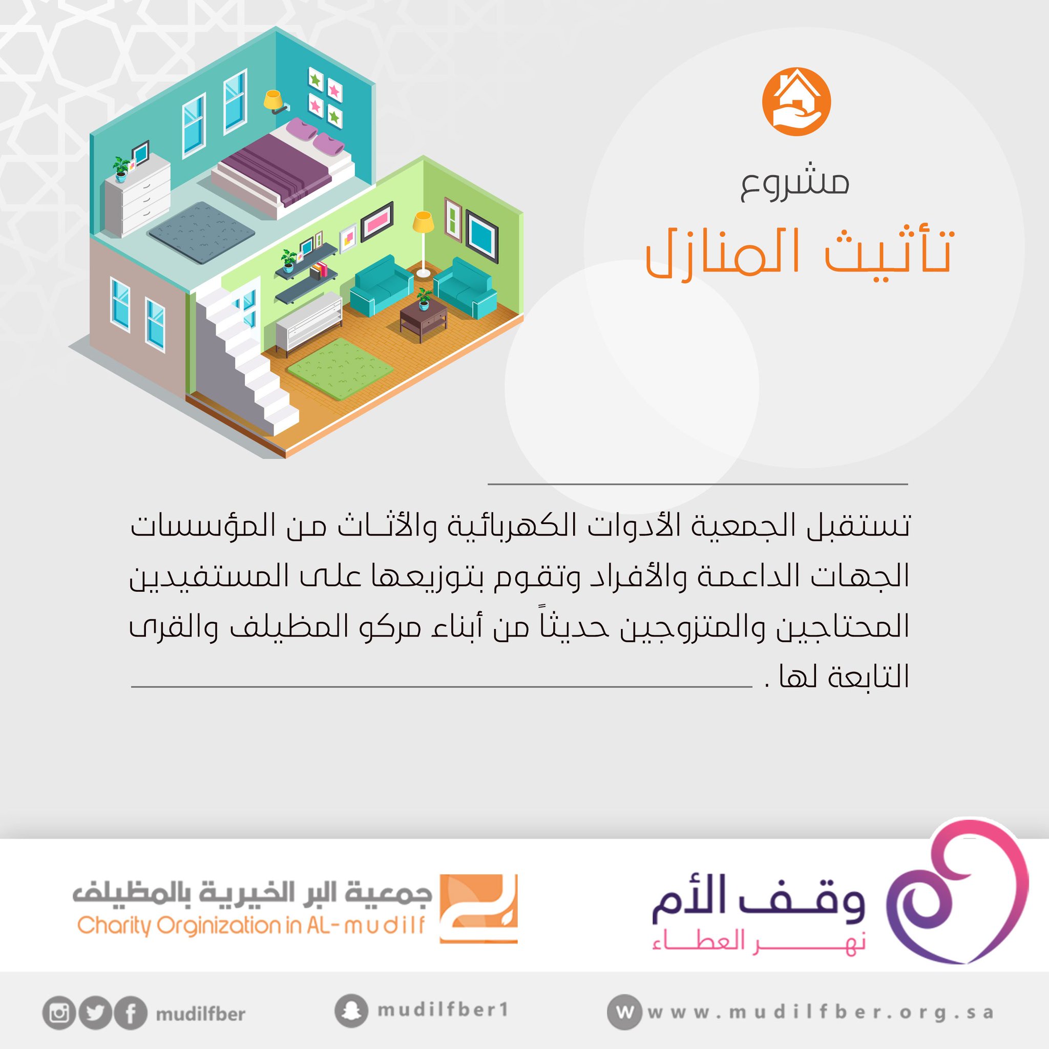 جمعية البر الأهلية بالمظيلف On Twitter من مشاريعنا تقدم جمعية البر الخيرية بالمظيلف لمستفيديها الرعاية الكامله والشاملة لكل احتياجاتهم ومن هذه المشاريع مشروع تأثيث المنازل وقف الام نهر العطاء زد رصيدك29 Https T Co Hq7gpfbfjp
