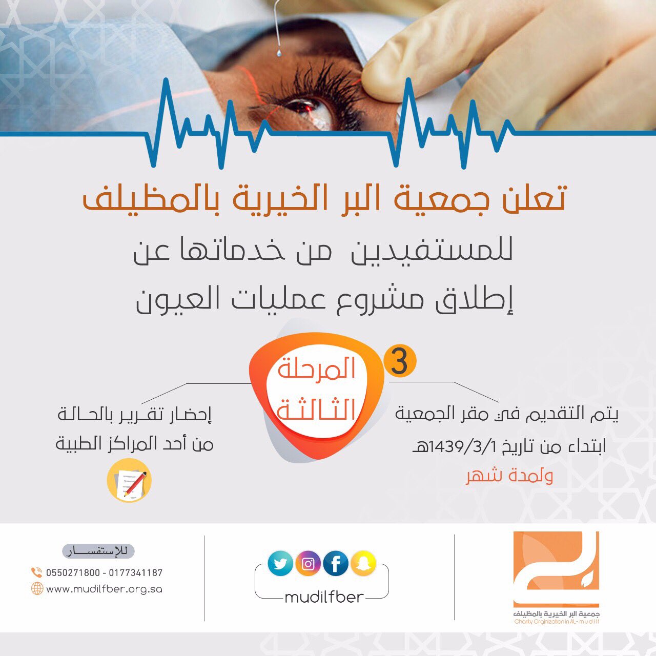 جمعية البر الأهلية بالمظيلف On Twitter تعلن جمعية البر الخيرية بالمظيلف للمستفيدين من خدماتها عن تدشين المرحلة الثالثة من مشروع عمليات العيون وللراغبين في الاستفادة من المشروع التقديم لدى مقر الجمعية بدء من